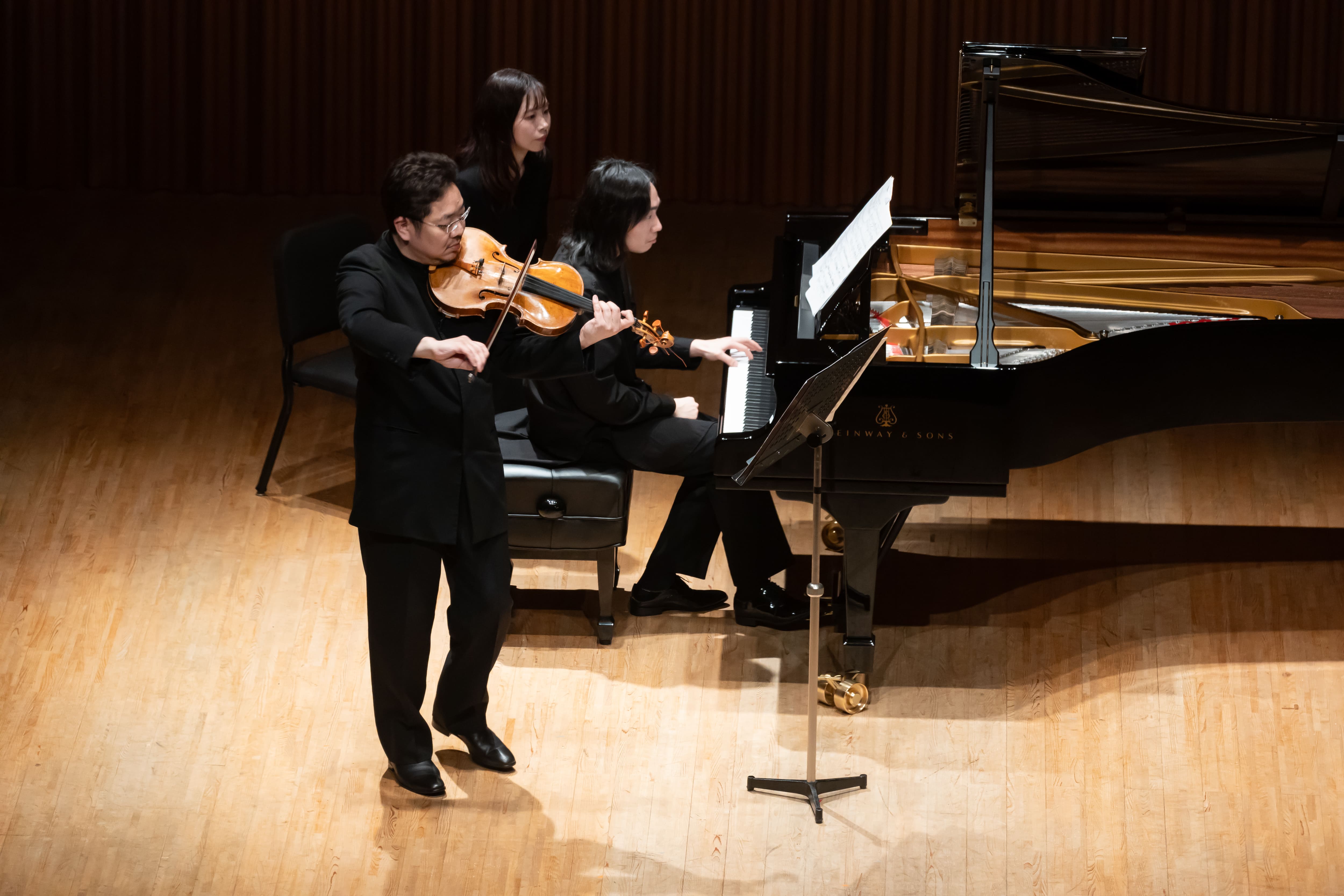 「阪田知樹と読響メンバーによる室内楽」で演奏する鈴木さん。ピアノは阪田さん=3月24日、東京都のトッパンホール(撮影・藤本崇)